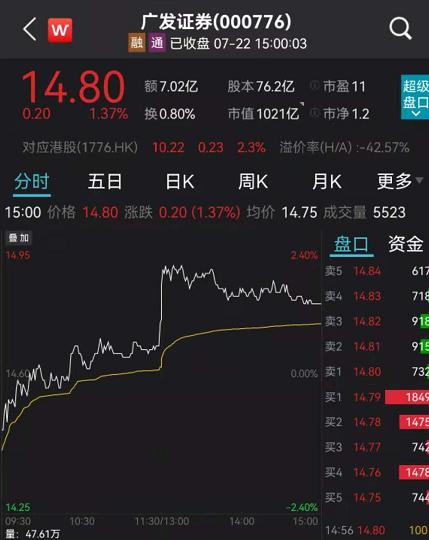 值得注意的是,在22日午后,广发证券的股价在午后突然直线拉涨超2%。最终收涨1.37%,市值1021亿元。
