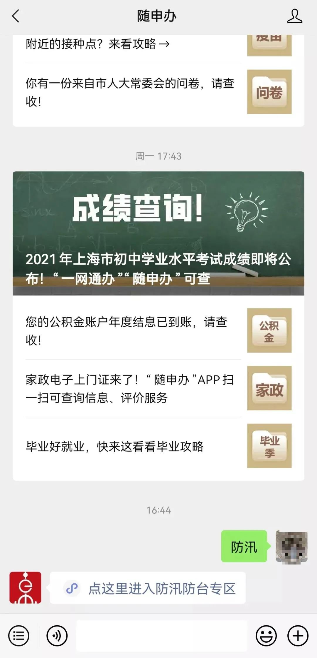 一是进入“随申办”微信公众号对话框,发送“防汛”,点击“点这里进入防汛防台专区”。