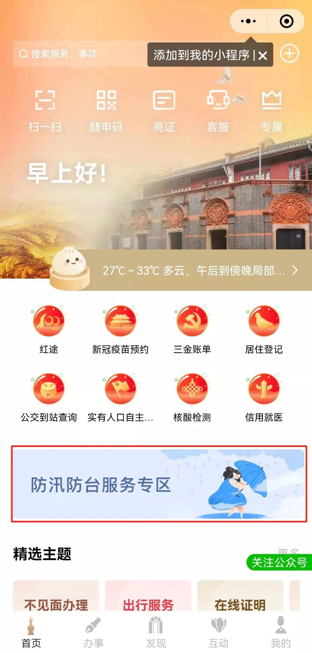 二是打开“随申办”客户端和“随申办”微信、支付宝小程序首页,点击“防汛防台服务专区”图片进入。