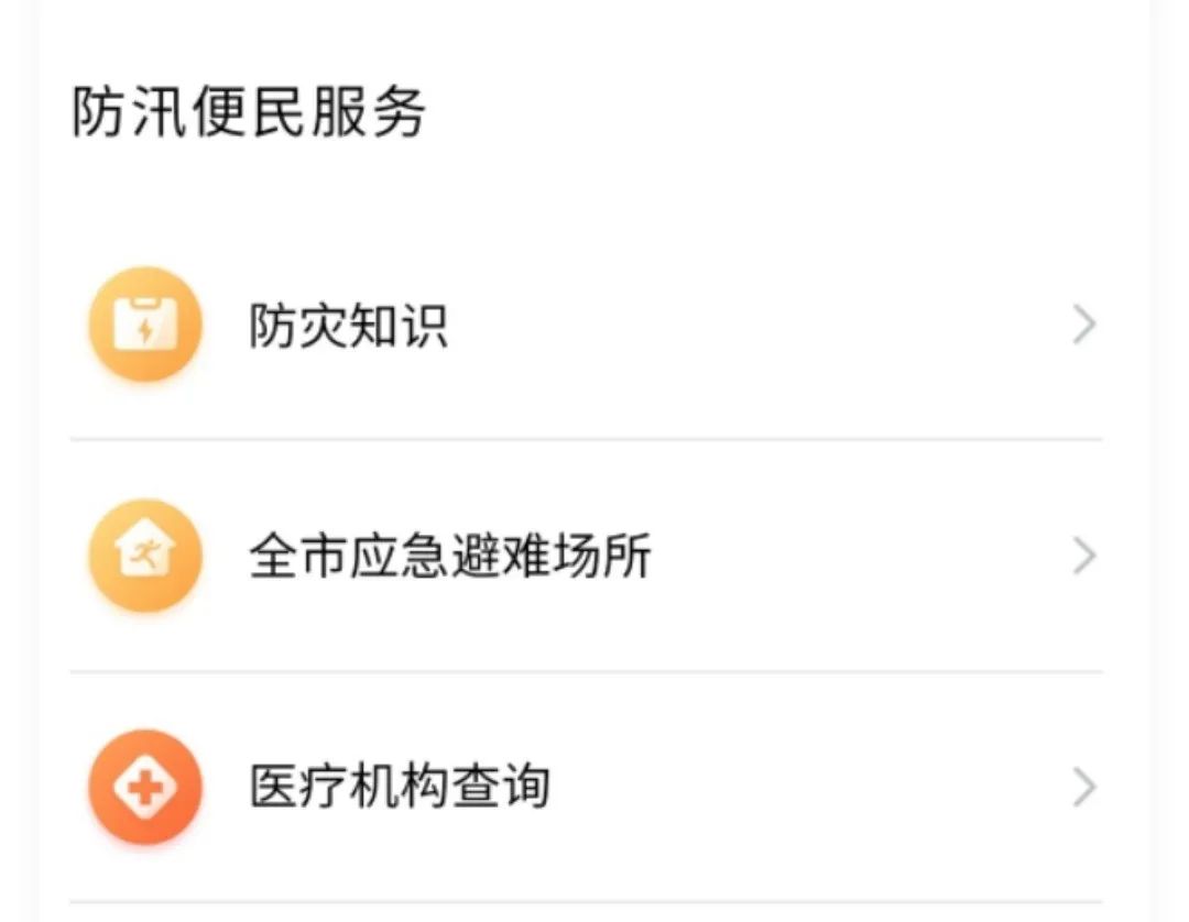 防汛便民服务板块提供了防灾知识、全市紧急避难场所、医疗机构查询,帮助市民在灾害来临时从容应对。
