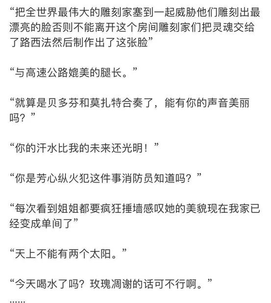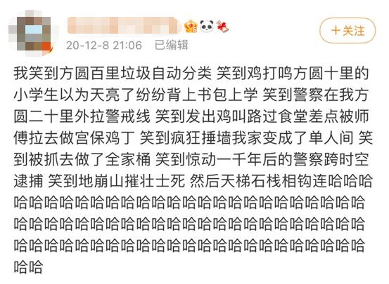 “我笑到头掉笑出猪叫邻居报警笑到我妈来爆我的狗头全小区都戴上助听器笑到的士司机把我拉走笑到右手握左脚左手比个心原地前空翻还要完美落地静脉曲张导致小拇指拉伤以至于司马光砸缸把自己砸伤方圆十里声控灯为我闪耀笑到一巴掌打在我法拉利上蹦出4节南孚电池我笑到花儿开了海儿哭了鸟儿把歌唱。”