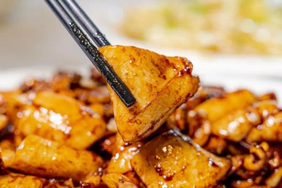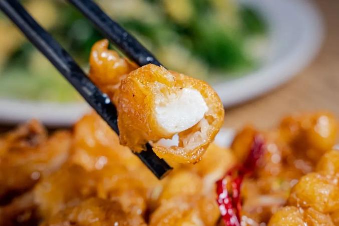 青岛菜的辣,主要都是起到提鲜的作用,辣味很轻微。香辣鱿鱼条实则是甜味占主导。从外观看,像是锅包肉或糖醋里脊,但实际上咬开是弹牙的鱿鱼条。
