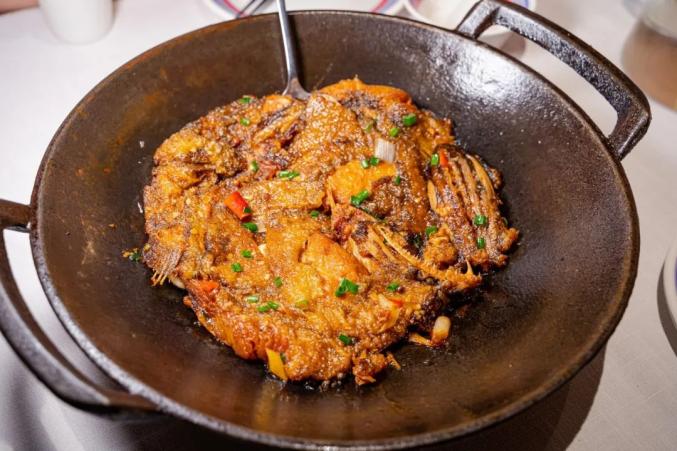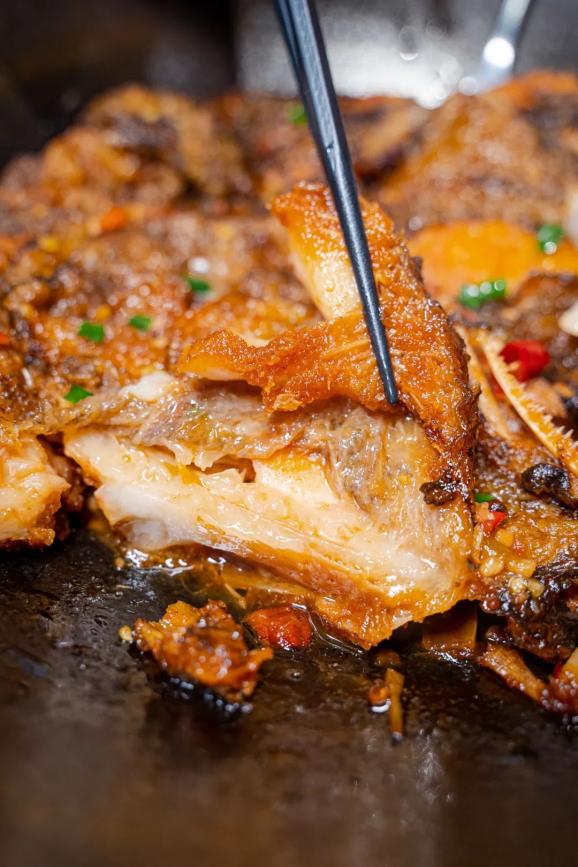 锅烧鲽鱼头可说是硬菜了,鲽鱼就是比目鱼。它和江浙常吃的“鸦片鱼”有点像,尤其是因为吃的都是鱼头,所以很多人会误以为是同一种鱼。