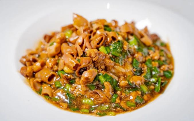 海肠脆脆的口感,搭配韭菜和肉糜,是一种巧妙的融合。韭菜在中国古代就被当作调料来使用,是“五辛”之一,可以提鲜去腥。