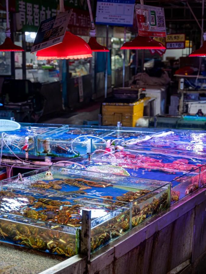 我们有点哭笑不得,但最后还是决定去营口路海鲜市场。营口路海鲜市场特地装修成了唐风,我们担心的宰客并没有发生,市场方也贴出告示明令禁止宰客。