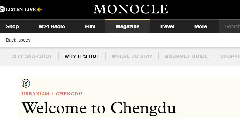全球知名时尚文化杂志《MONOCLE》(6月号)也刊发了一篇题为《欢迎来到成都》的文章,指出随着越来越多的国际航线开通,到达成都变得越来越容易。“飞赴这座中国最宜居城市,体验一次为期6天的免签旅行,你肯定会大有收获。”