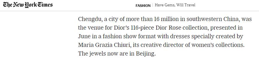 据《纽约时报》报道,6月7日晚,全新“迪奥玫瑰”高级珠宝系列在成都盛大发布,400余件高级珠宝及腕表臻作尽数登场。这也是继去年全新 Tie&DIOR 顶级珠宝系列在上海发布之后,迪奥第二次选址中国进行高珠发布。