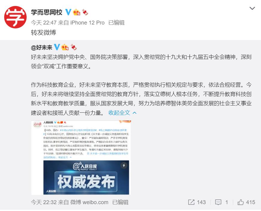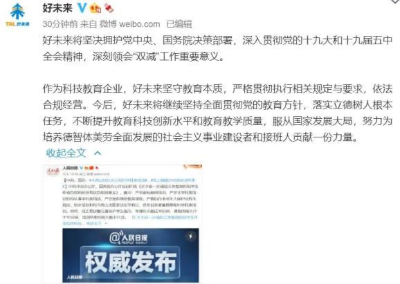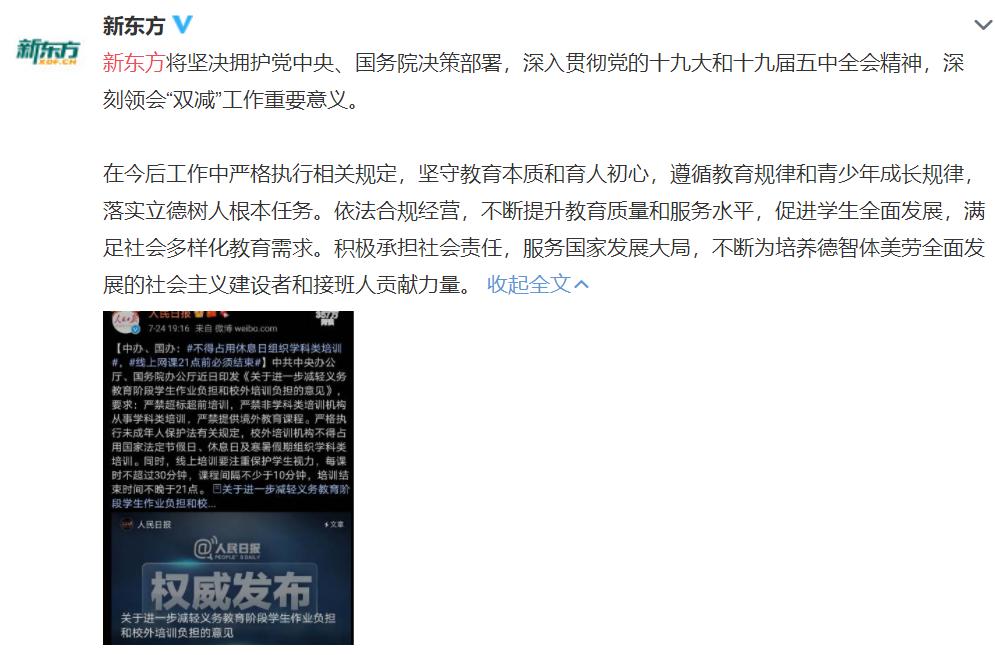 新东方24日晚在其官方微博回应称,新东方将坚决拥护党中央、国务院决策部署,深入贯彻党的十九大和十九届五中全会精神,深刻领会“双减”工作重要意义。