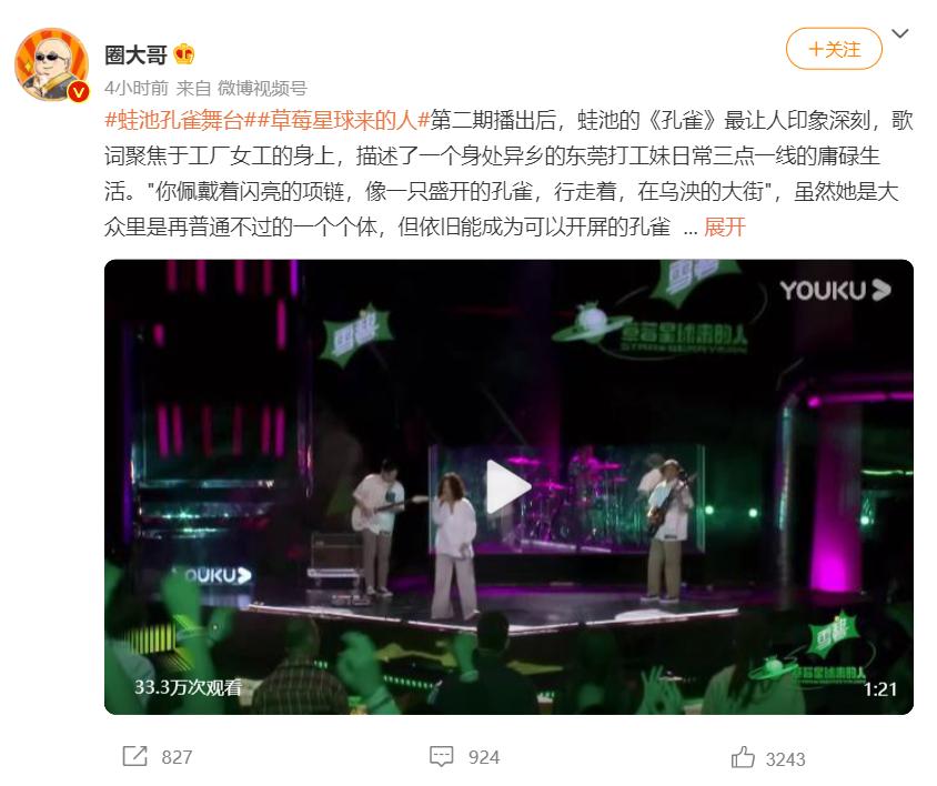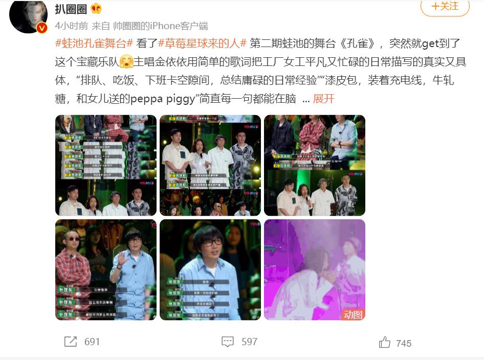 而比一时的胜负或晋级更重要的是,他们这首《孔雀》终于被更多人听见了。节目播出后,微博上便出现了#蛙池孔雀舞台#这个话题。