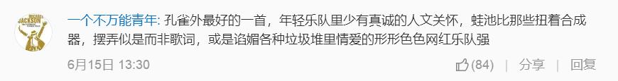 有人在《小唐》下面留言说:“《孔雀》外最好的一首,年轻乐队里少有真诚的人文关怀,蛙池比那些扭着合成器,摆弄似是而非歌词,或是谄媚各种垃圾堆里情爱的形形色色网红乐队强。”