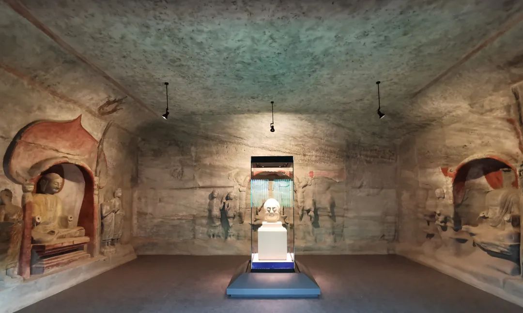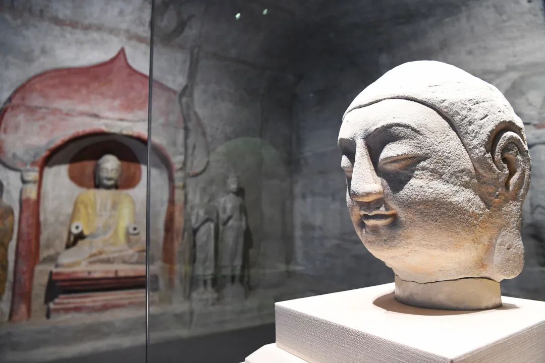 步入第二展厅“盛世之归”单元,你会觉得有穿越感,因为展厅被复建成了第八窟的模样,洞窟北壁、东壁、西壁佛龛及造像完全呈现到室内,佛首就被摆放在展厅正中间,营造出昔日“家”的氛围。这眼前的整体画面,会让人觉得内心安宁:佛首终于到家了。