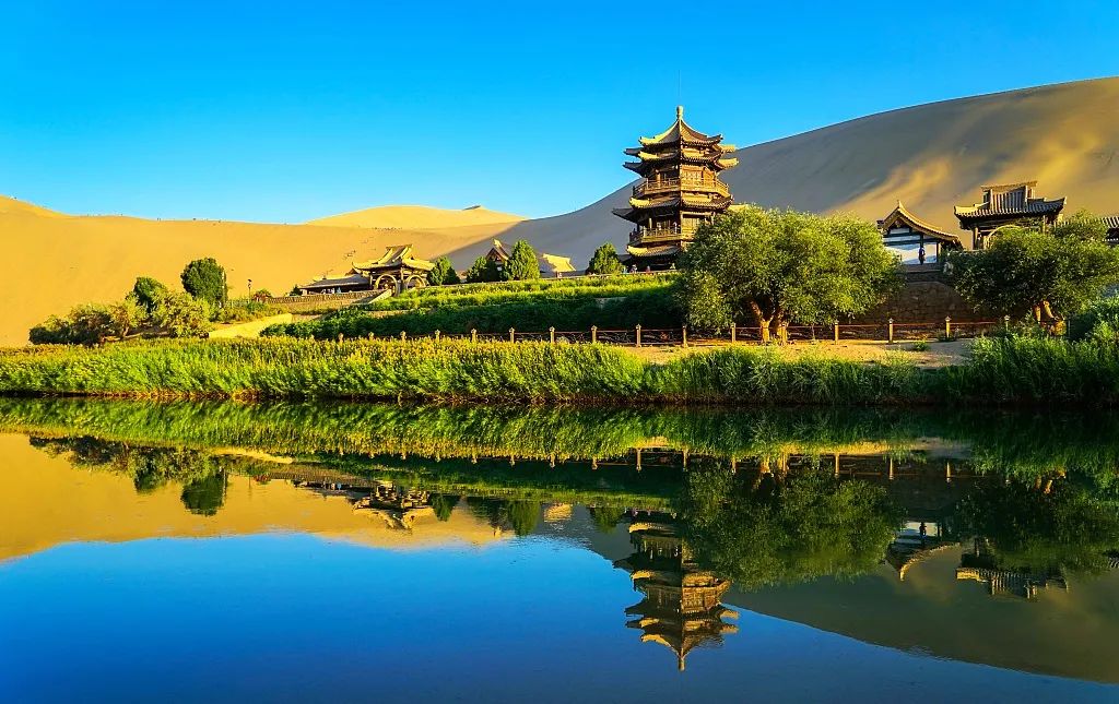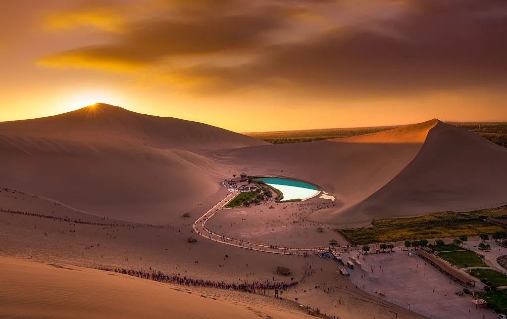 驼铃悠悠,沙漠茫茫,原本于世无奇。然而当鸣沙山怀抱成湾,并在绿洲中孕育出月牙泉这一生命之源后,一切都变得那么不同寻常。