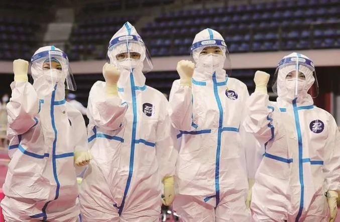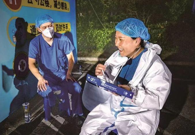 22日晚,南京市浦口区中医院的医护人员在完成了南京市第一轮核酸检测采集工作后,终于露出了欣慰的笑容。薛晓红 摄