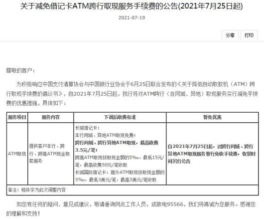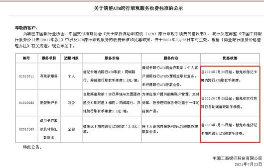 7月23日,中国工商银行和中国农业银行也通过官网发布通知,从2021年7月25日起,对ATM跨行(含同城、异地)取现暂免收手续费。