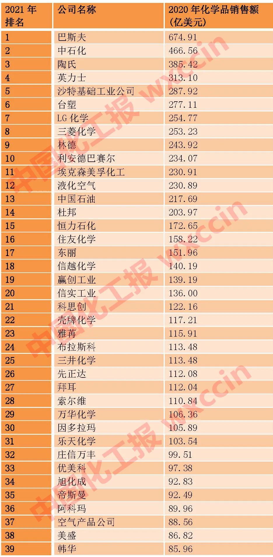 原标题:《2021全球化工50强:中石化仍居亚军,中石油、恒力、万华、荣盛上榜(全名单)》