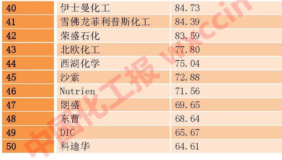 去年的50强中有三家公司今年未能入围。艺康因为剥离油田化学业务;SK Innovation和PTT全球化工都是石化销售下滑的受害者。