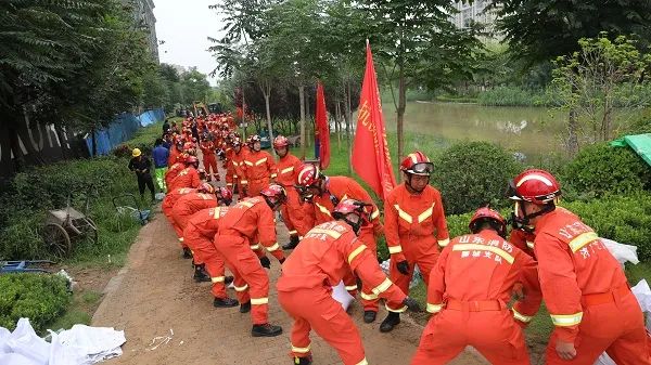 21日16时许,山东消防增援队根据前指命令,赶到开封市东京大道的碧水河堤封堵决口。这时的碧水河水位几乎与堤岸齐平,涌浪哗哗地冲击着堤岸,小股水流不时从沙袋间的缝隙里钻出来。决口的河堤长度将近30米,20米之外就是居民楼。