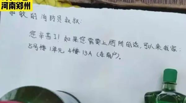 同样在23日,在郑州嘉辰丽景苑小区排涝点,一位小女孩放在椅子上的手写纸条,让山东消防队员感动不已。上面写着:“尊敬的消防员叔叔,您辛苦了!如果您需要上厕所的话,可以来我家!”