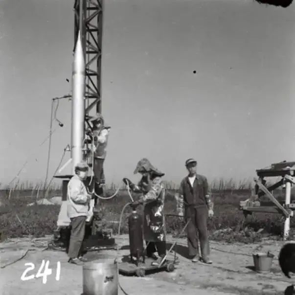 1960年2月,在上海市简易机场,研制人员正用自行车打气筒作为压力源,为我国第一枚液体燃料探空火箭“T-7M”加注推进剂