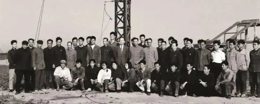 1960年4月17日,在上海市探空火箭发射架前,钱学森、王希季等海外归国专家与参加发射任务的科研人员合影