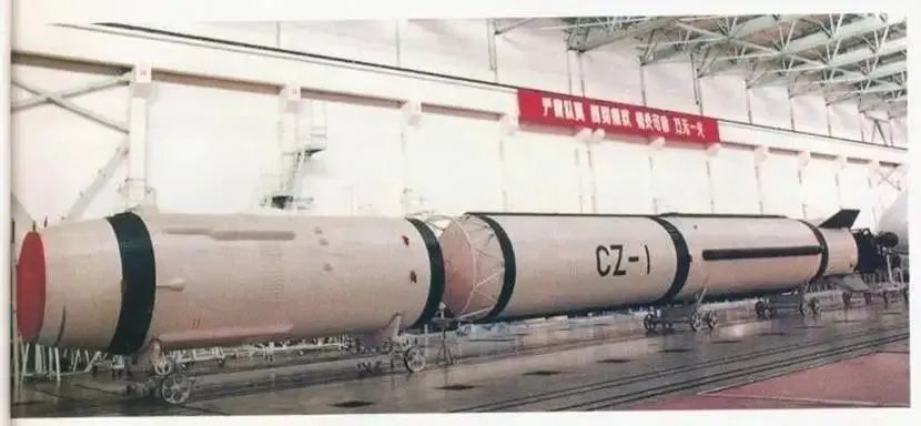 停放在总装车间的我国自行研制的第一种航天运载火箭“长征一号”