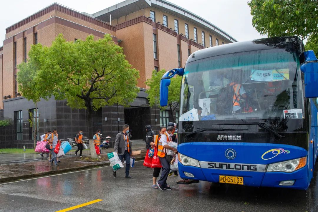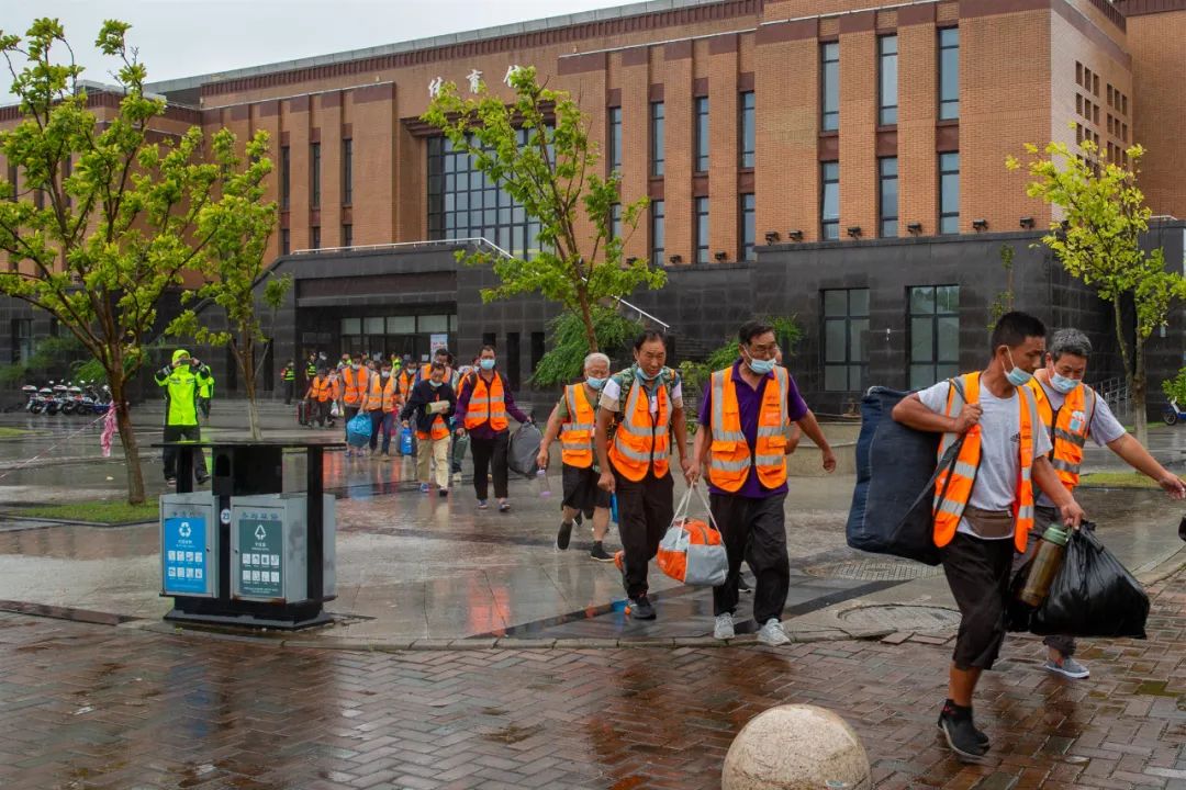 过了约一个小时,接安置人员的大巴陆续开了进来。工人们陆续排队,登上大巴离开。回到位于南港大道的中铁建设“建设者小镇”的住处。