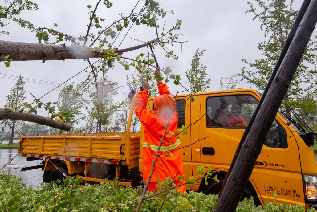 临港安置人员全部回撤,养护人员冒雨清理倒伏树木