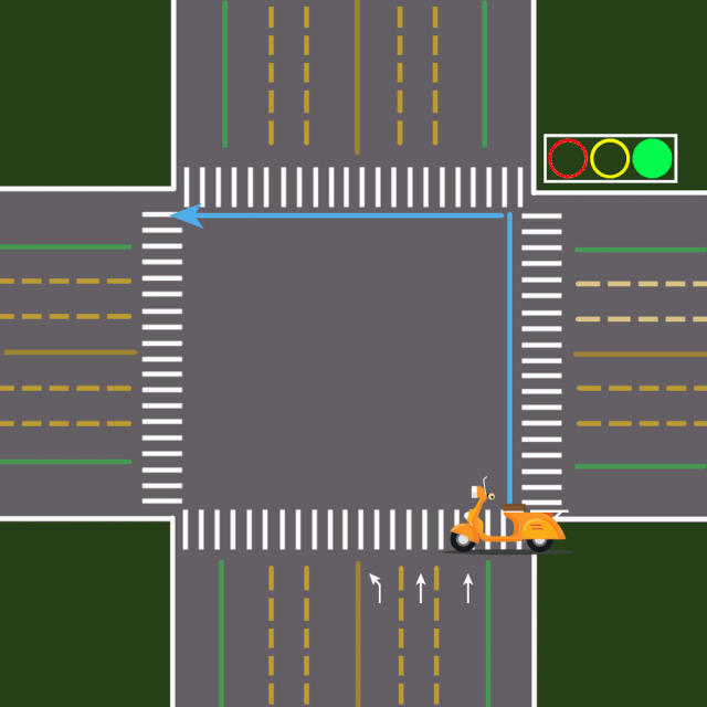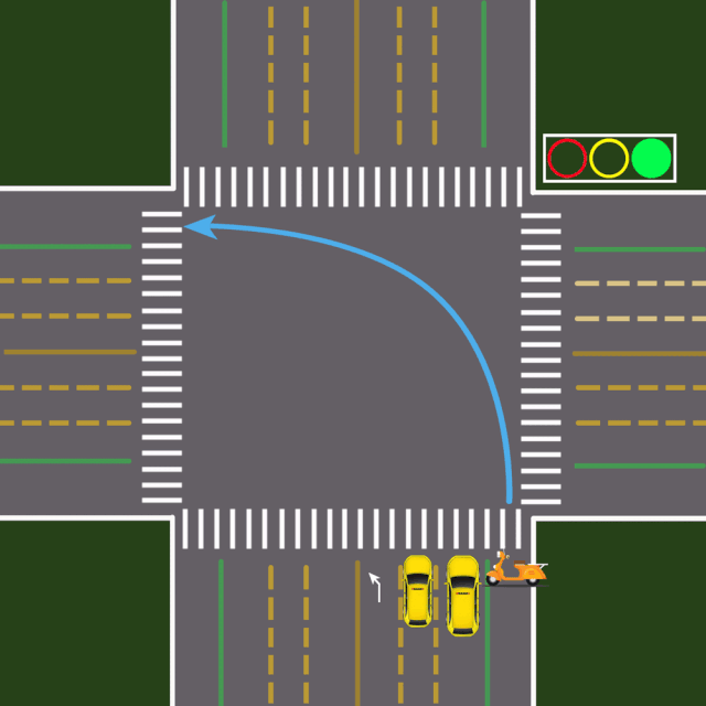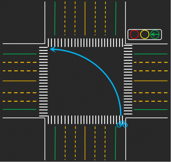 如果没有设置左转信号灯,或者左转与直行同时放行,此时非机动车转弯让直行机动车,先直行过路口,等待左侧绿灯亮起,再向左侧通行。