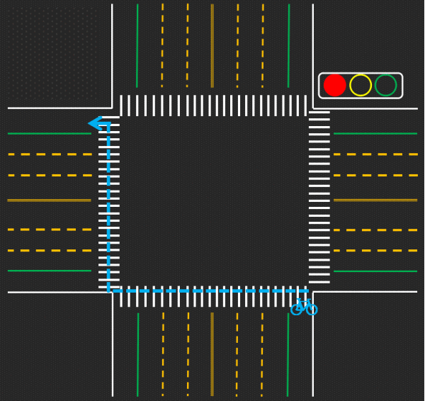 左转、直行自行车应在非机动车道左侧等待,自觉空出右侧供右转自行车通过。