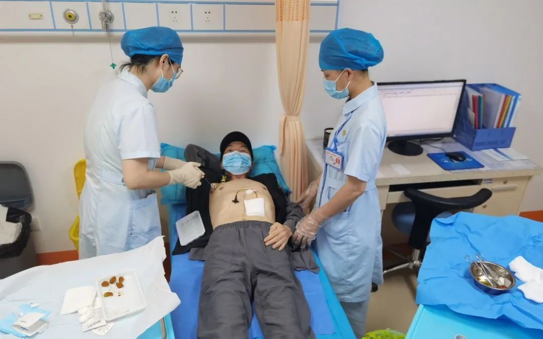 在护理诊室里,静脉治疗专科护士与伤口造口专科护士联合会诊,同步操作,很快,就为林女士父亲的肠造瘘口换好药,并做好了输液港的维护。一个诊室同时完成了两项护理,省去了两个科室之间的奔波,林女士的父亲感觉轻松多了。