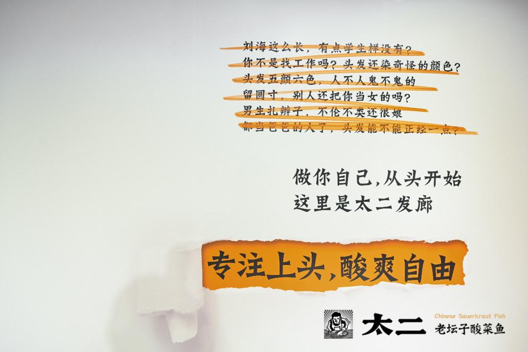 从中医馆到澡堂到发廊,太二通过系列活动一直在强化“酸爽标签”。而本次的发廊活动重在倡导年轻人“专注上头,酸爽自由;剪掉标签,真实做自己”。