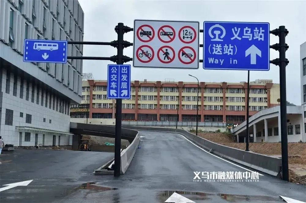 通过一块块清晰的指示牌,记者驾驶着车辆从崭新的通道进入“义乌之门”。此次投用新增及调整道路5条,包括站南一路、站南二路、站南三路、站南四路和广场大道。本次沿广场大道主要开通3个入口,其中1个送客进站入口,2个地下停车场入口。同时启用送客入站口仅1个,位于枢纽大楼二层,行人需根据指示牌前往枢纽大楼二层进站。
