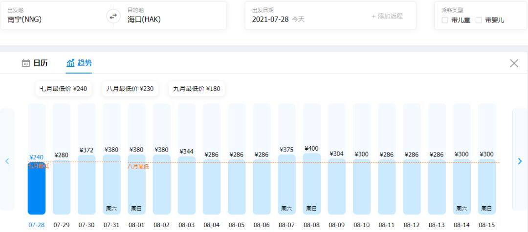 7月底至8月初,深圳航空南宁出发至海口,最低有3折;