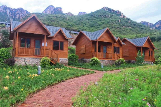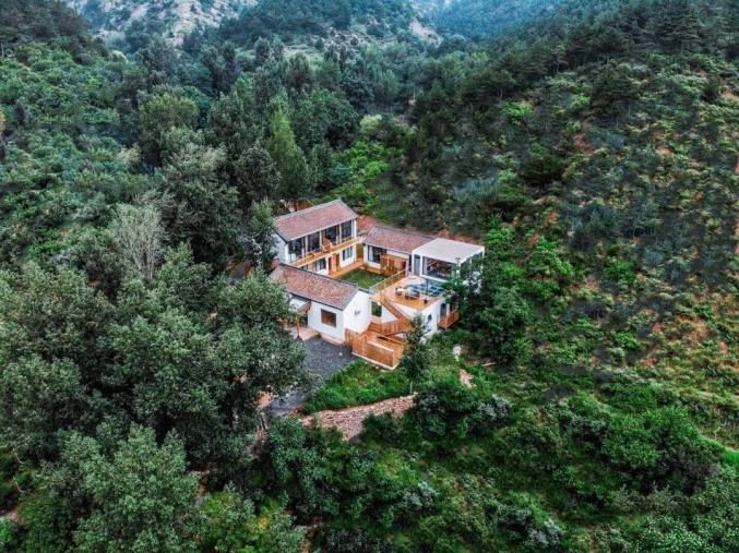 山间木屋位于冰塘峪景区内,它藏匿于山谷之间,被群山环绕,前有山涧溪流,后有青山绿林。