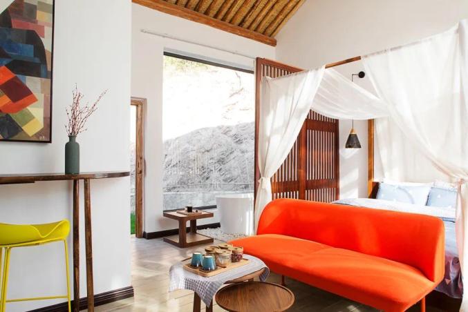 在房间配置上,自动窗帘、智能马桶、马油洗浴套装、沙发……每个房间还配有四种花茶。山今宿虽然隐于深山,生活品质却一直在线。
