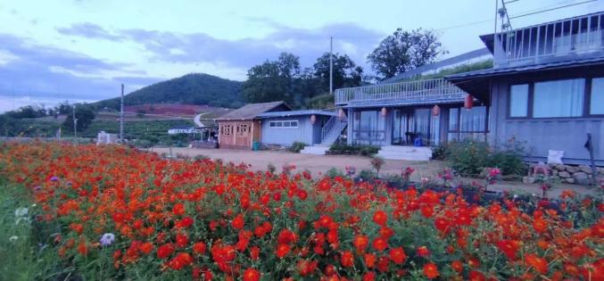 这里的民宿别具特色,有两处集装箱主题民宿,是难得的“海”景房。推开窗便是花海,还可远眺松花湖美景。