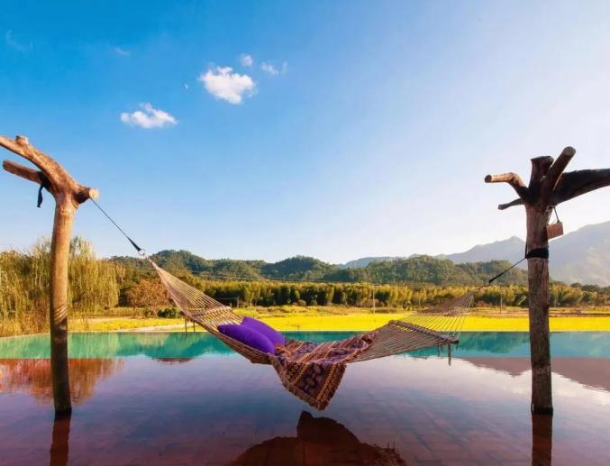 设计师将竹、木元素延续到客房内,巨大的落地窗,视野十分开阔。民宿最引人注目的还要数那方无边泳池。海蓝相间,与清风田野自然交融,即便不下水,蜷在泳池边的吊床上,看日落慢慢躲进山坳,也是件极美的事。