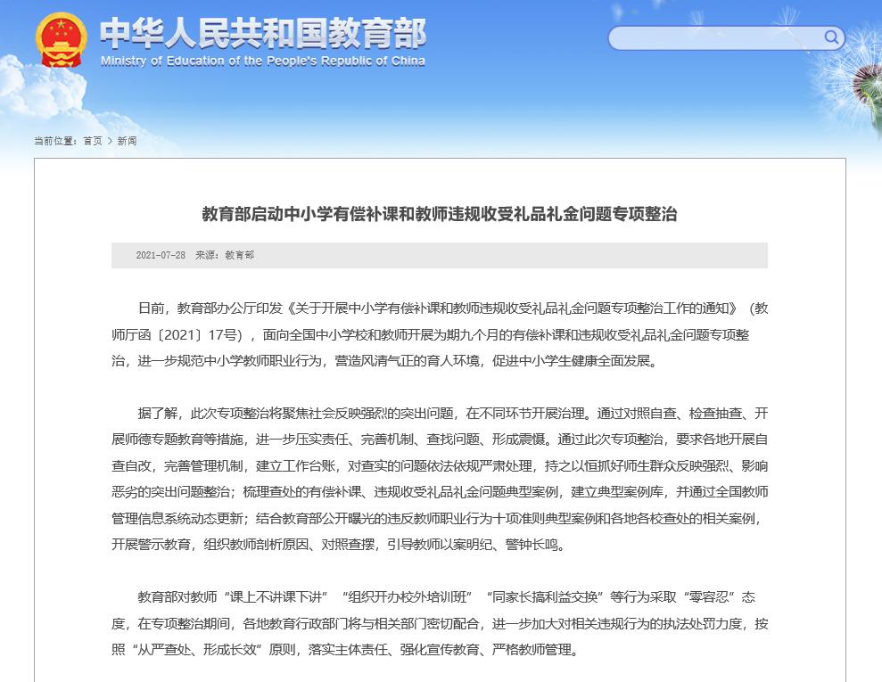 教育部网站消息,日前,教育部办公厅印发《关于开展中小学有偿补课和教师违规收受礼品礼金问题专项整治工作的通知》(教师厅函〔2021〕17号),面向全国中小学校和教师开展为期九个月的有偿补课和违规收受礼品礼金问题专项整治,进一步规范中小学教师职业行为,营造风清气正的育人环境,促进中小学生健康全面发展。