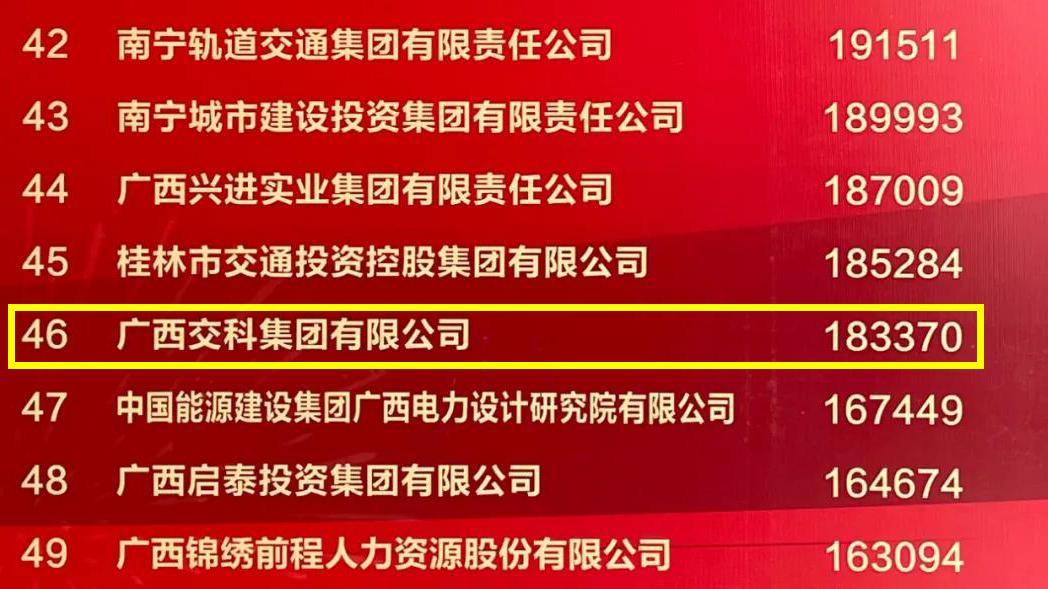 广西北部湾投资集团荣列榜单第八位,自2018年重组以来,连续3年位居榜单前十强。直属企业广西交科集团位居“广西服务业企业50强”榜单第46名。