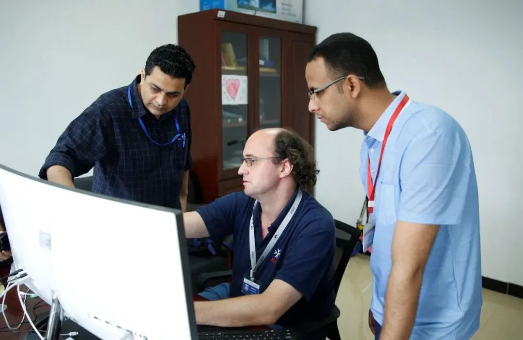 德国科学家沃尔夫冈(中)与团队正在进行科学讨论