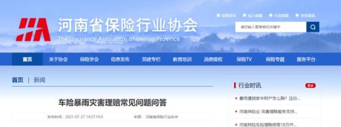 7月28日,河南省保险行业协会网站发布《车险暴雨灾害理赔常见问题问答》。