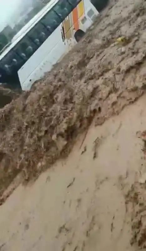 我当时全身湿透,正在拧衣服,马上穿好衣服跑出去帮忙。只见斜坡下的国道路口,一辆大巴靠近对面的河堤,被水冲得摇摇晃晃的,车里的人都出来了,站河堤上抱着树,隔着湍急的水流冲我们喊话,听不清说了什么。另一辆在30米外,紧挨着加油站,车里情形看不清,只能看到车顶上坐着四五个女孩,边喊边哭,侧门下方还有两三个男孩在一棵冲倒的树上站着,抱着加油机,让我们抛绳子过去。
