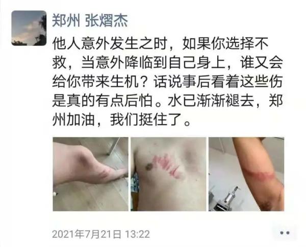 几乎同时,22岁的退伍兵、金水法院执行局书记员张冰阳,自发与数名获救乘客组成救援队,在五号线地铁隧道里涉水“捞人”,三四小时内,他的手可能拽回了数百条生命。