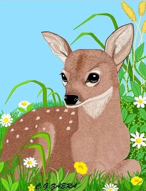 小动物也是她常画的,例如在花丛中小憩的小鹿: