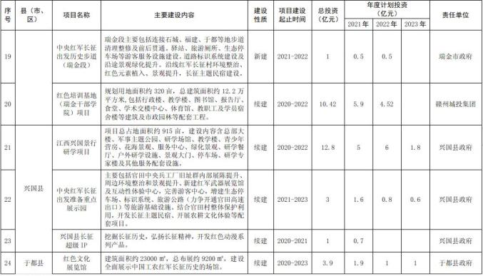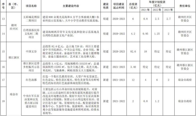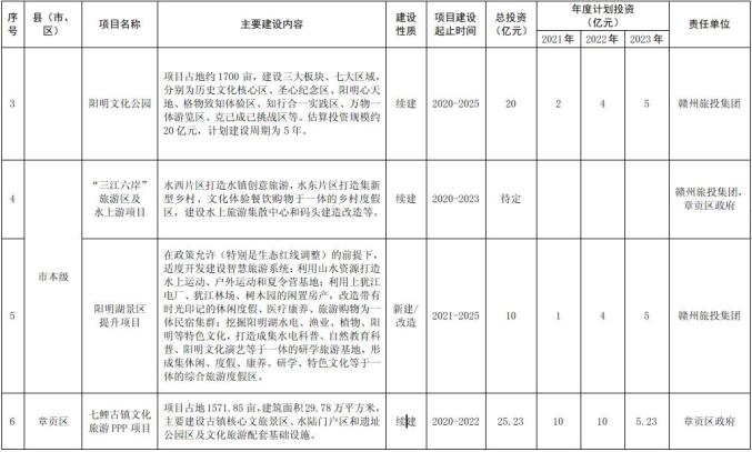 3.建设融合项目。各县(市、区)围绕文化旅游资源优势和产业布局,重点做精做强1个核心项目,充分发挥核心项目引领作用。建立重点项目滚动推进计划,推进一批文化旅游融合项目建设,三年完成投资600亿元以上。加快推进长征国家文化公园(赣州段)、江南宋城、红色故都、阳明文化公园、阳明湖等核心项目建设。建立重大文旅项目调度机制,文旅项目用地会商机制、文旅项目融资对接机制。