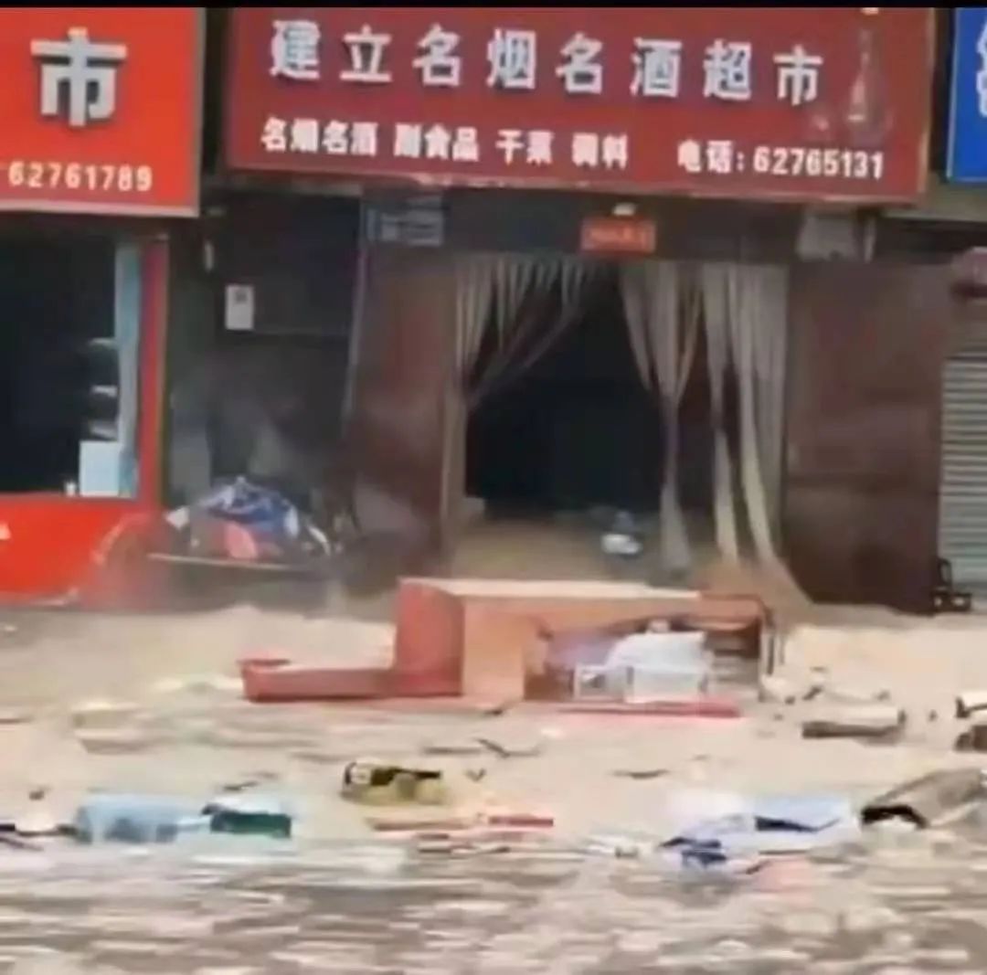 还有酒商展示了一个街面酒水超市被洪水冲击的视频,他表示:“这是一个同行的名酒超市被淹,只能眼睁睁的看着一箱一箱的酒被冲走,我们的仓库目前还在抢救中,已经有几百箱白酒被浸泡。”