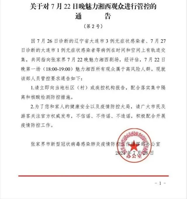 因7月26日诊断的辽宁省大连市3例无症状感染者、7月27日诊断的大连市1例无症状感染者等病例在时间和空间上有轨迹交集,共同指向张家界7月22晚魅力湘西剧场,经评估,7月22日晚第一场(18:00-19:00)魅力湘西所有观众属于高风险人群。现就该部人员管控要求通告如下: