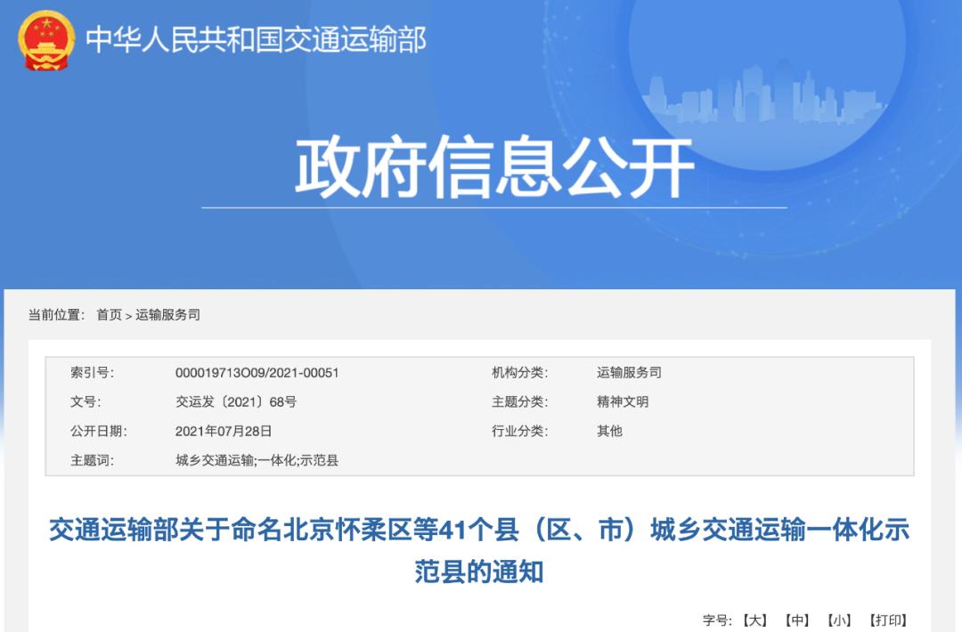 7月28日,交通运输部发布《关于命名北京怀柔区等41个县(区、市)城乡交通运输一体化示范县的通知》。交通运输部组织开展城乡交通运输一体化示范县创建以来,各创建县持续加大投入、完善配套政策,城乡交通运输一体化发展水平显著提升。
