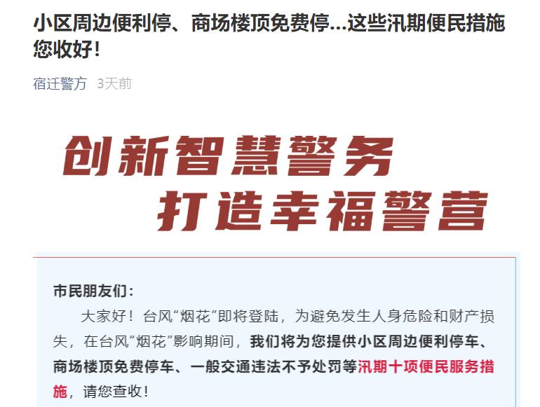 全方位提示预警。宿迁公安出台小区周边便利停车、商场楼顶免费停车、一般交通违法不予处罚等汛期十项便民服务措施之外,还围绕车主、船主等重点,主动排查公布全市148处低洼易积水点位,多渠道多载体宣传,便于市民实时掌握。与此同时,会同航道、海事部门及时发布预警信息和航行警告,提醒船主船员加强船舶管理、规范船舶停泊、强化锚系措施。