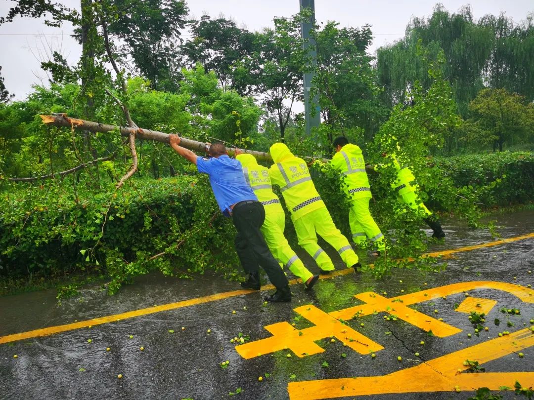 7月28日上午,经济开发区分局民警王龙飞处警回所途中,在北京路南侧发现五棵大树倒伏,其中一颗较粗的树木横跨在慢车道和右转车道上,时值上班高峰,加之雨量很大,王龙飞立即停车处置。